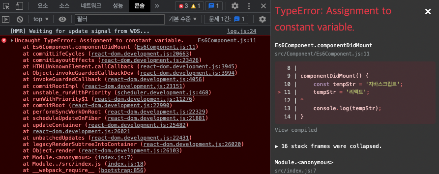 1. 이미 선언한 const 변수 tempStr에 새로운 값을 할당했을 때 발생