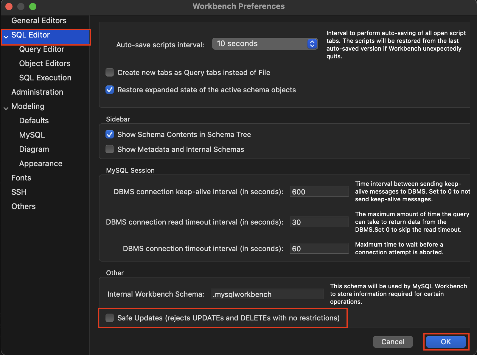 2. SQL Editor 탭에서 Safe Updates 옵션을 찾아 체크 해제합니다.