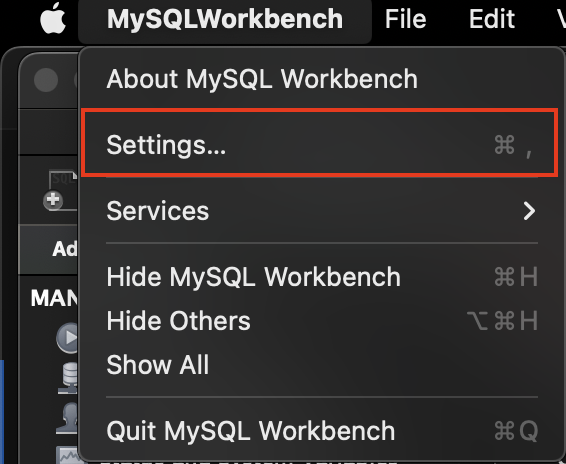 1. MySQL Workbench를 사용 중인 경우, Settings...를 클릭합니다.