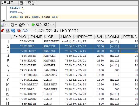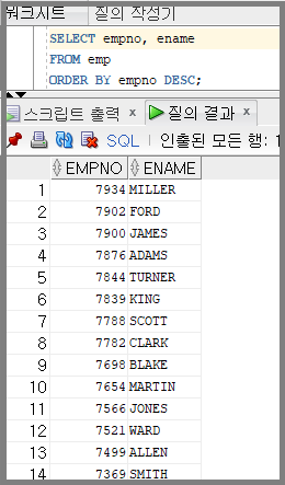 DESC는 내림차순으로 EMPNO가 높은게 가장 위에 출력되었고 그 이후부터 내림차순으로 출력이 되었네요.