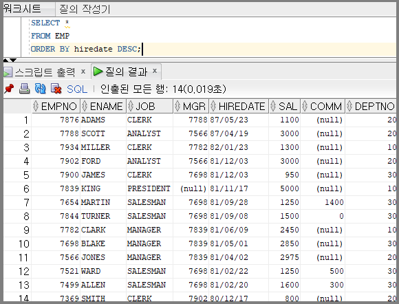 HIREDATE가 높은 순서대로 조회되는 것을 확인할 수 있습니다.