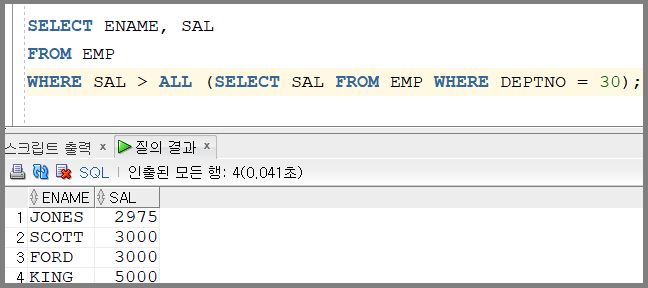 - ALL 조건은 메인 쿼리의 비교 조건이 서브 쿼리의 검색 결과와 모든 값이 일치하면 참입니다.