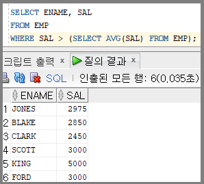 EX) 평균 급여를 구하는 쿼리문을 서브 쿼리로 사용하여 평균 급여보다 더 많은 급여를 받는 사원을 검색하는 쿼리 예제