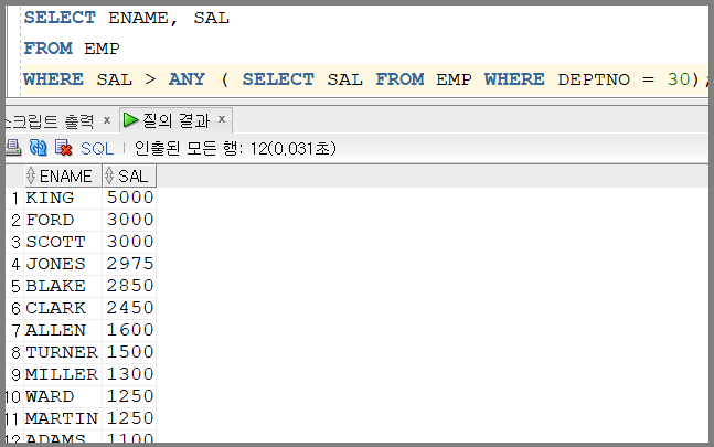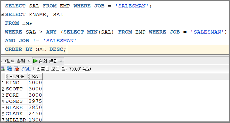 - 컬럼명 > ANY 는 찾아진 값에 대해서 하나라도 크면 참이 되는 셈이 됩니다. 그러므로 찾아진 값 중에서 가장 작은 값 즉, 최소값 보다 크면 참이 됩니다.