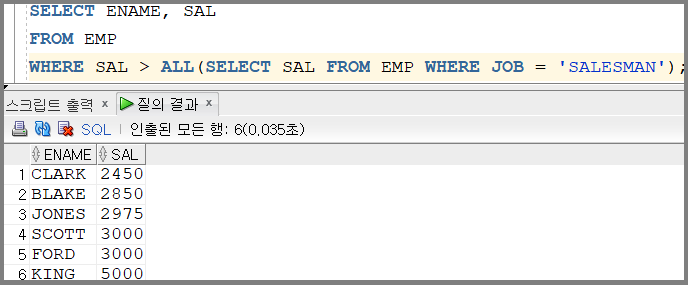 - 컬럼명 > ALL 은 "컬럼명의 모든 비교값 보다 크냐"고 묻는 것이 되므로 최대값보다 더 크면 참이 됩니다.