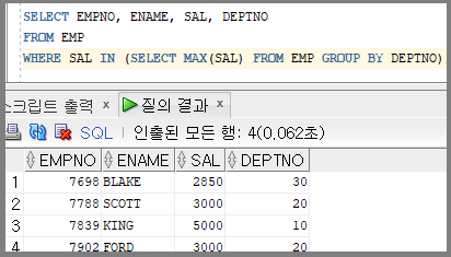 - 메인 쿼리의 비교 조건 ('=' 연산자로 비교할 경우)이 서브 쿼리의 결과 중에서 하나라도 일치하면 참입니다.