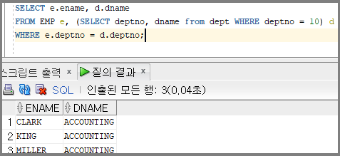 EX) 10번 부서에 근무하는 사원의 이름과 10번 부서의 부서명을 출력
