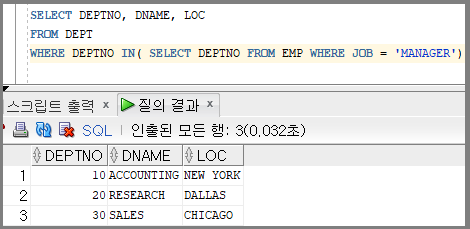 EX) 직급(JOB)이 MANAGER인 사람이 속한 부서의 부서 번호와 부서명과 지역을 출력하시오.