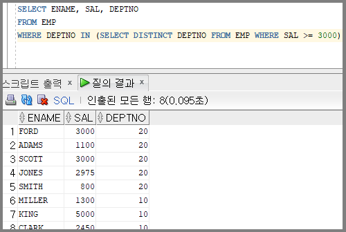 EX) 3000 이상 받는 사원이 소속된 부서(10번, 20번)와 동일한 부서에서 근무하는 사원이기에 서브 쿼리의 결과 중에서 하나라도 일치하면 참인 결과를 구하는 IN 연산자와 함께 사용되어야 합니다.
