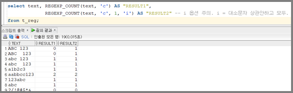 아래 쿼리는 RESULT2 컬럼에서 소문자 I 옵션을 줘서 대소문자 구분 없이 모두 몇 개가 나오는지 세어서 출력하는 예제입니다.