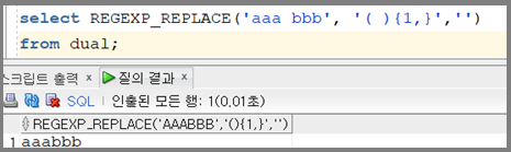 다음 예는 ‘abc bbb’에서 ( ) (괄호 사이는 공백)이 {2,} (두 칸 이상)인 것을 찾아서 “(공백을 제거)하라는 의미입니다. 그래서 그 결과로 공백이 한 칸인 첫 번째 ‘aaa bbb’값은 공백이 제거되지 않은 채 출력되었고 공백이 두 칸인 두 번째 ‘aaa bbb’은 공백이 제거되어 출력되었습니다.