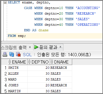 - DECODE 함수와 차이점이 있다면 DECODE 함수는 조건이 일치하는 경우에 대해서만 적용되는 반면,