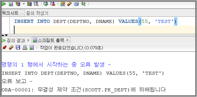 따라서, 아까 삽입하려 했던 DEPTNO컬럼의 값이 이미 테이블에 같은 값이 있다면 삽입은 불가능합니다.