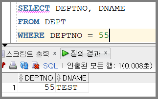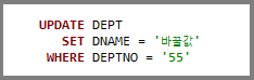 아래의 쿼리는 DEPT 테이블의 DEPTNO가 55인 값인 것의 DNAME을 '바꿀값'으로 바꾸는 예제입니다.