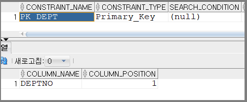 아래의 조회 화면을 보니 DEPT 테이블의 기본키 값으로 DEPTNO가 있습니다.