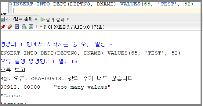 위의 쿼리를 실행하니 ORA-00913: too many values 에러가 발생하였습니다.