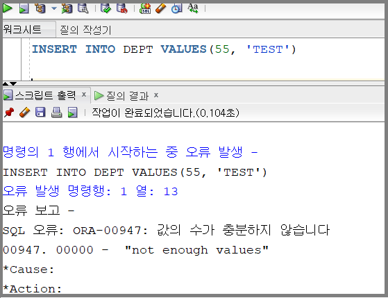위의 쿼리를 실행하니 ORA-00947: not enough values 에러가 발생하였습니다.