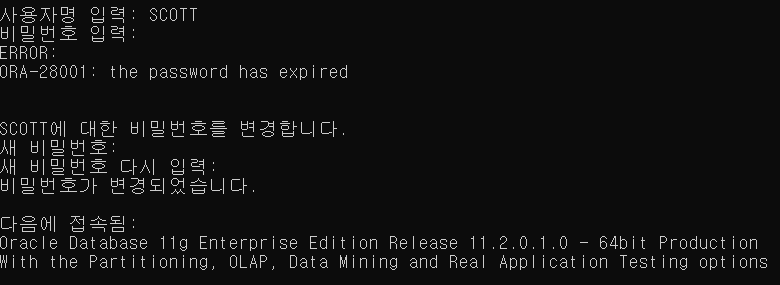 계정에 SCOTT 비밀번호에 TIGER를 입력하니 비밀번호가 만기 되었다고 나오네요.