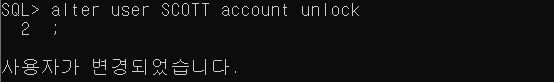 2. [ ALTER USER SCOTT account unlock; ]을 입력합니다.