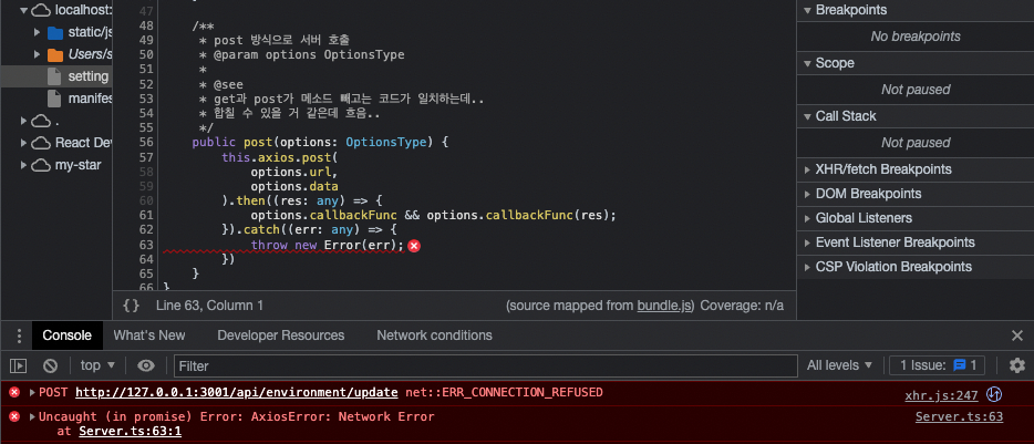 axios 라이브러리를 이용하여 post 방식으로 api를 호출하였는데 호출이 제대로 되지 않아 에러가 발생하였습니다. 에러를 로그로 찍어서 확인해 보니 'Uncaught (in promise) Error: AxiosError: Request failed with status code 500' 이었습니다.