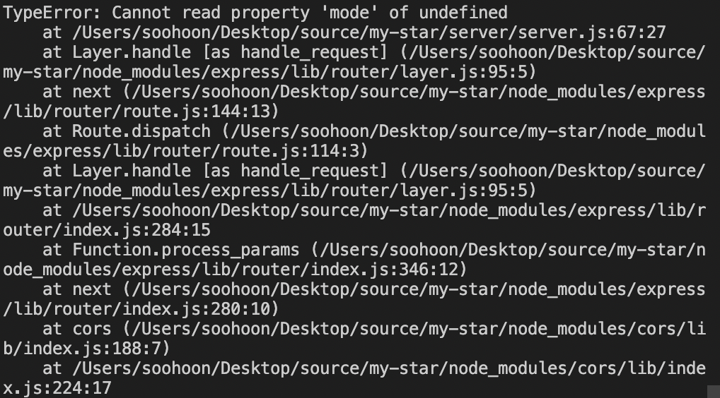 더 자세히 알아보기 위해 작업하던 VS 코드에서 터미널로 로그를 확인해보니 'TypeError: Cannot read property 'mode' of undefined'라고 에러가 뜨는 걸 확인할 수 있었습니다. 아래의 mode 변수에서 req.body에 데이터가 없어서 발생한 거라는데.. 요청 값은 이상 없이 잘 전달하고 있었습니다.