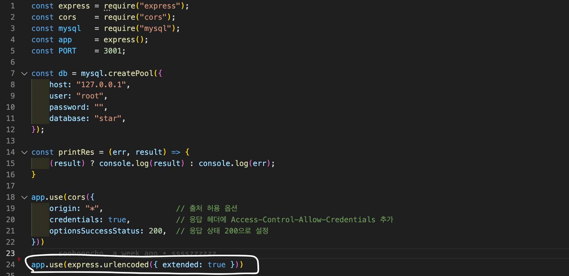 요청의 본문에 있는 데이터가 URL-encoded 형식의 문자열로 넘어오기 때문에 객체로의 변환이 필요해서 express.urlencoded를 사용해주어야 합니다. express.urlencoded는 express 서버로 post 요청을 할 때 값을 전달해주기 위해 사용합니다. 즉, 요청의 본문에 있는 데이터를 req.body 객체로 만들어주는 미들웨어입니다. 아래와 같이 추가하면 에러 없이 데이터를 객체 형태로 잘 넘겨 에러가 발생하지 않을 것 입니다.